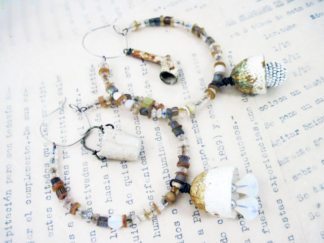 These very special bablies center on ceramic bucket and pipe with a hoop of moonstone, labradorite, sequins and Indonesian glass. The dangle caps are silkworm cocoons! with gold leaf because why not. And a lot of sealant glue on top for protection. One of the drops is a vintage something I put wax paste w/dirt in to highlight the beads.